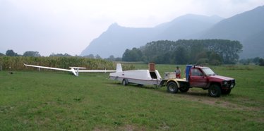 Donnerstag, 24.8.06 Das Wetter verschlechterte sich weiter. Es ist wirklich kein Flugtag. Um neun mache ich mich auf den Weg zurück mit Auto und Anhänger. Es sind 200km und 3,5 Stunden Fahrt - einfach. Hinfahrt, Abbauen, Zurückfahren, zwei Landeäcker begutachten und Einkaufen hat den ganzen Tag gedauert.